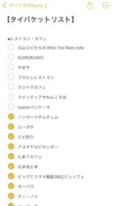 私はスマホのメモ帳にこのように「レストラン・カフェ」「場所」「美容」「買うもの」など、項目ごとに箇条書きで書いていました。(自分が分かればOKなのでかなり適当です笑)