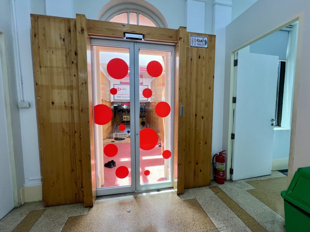 奥にある、草間彌生を彷彿とさせるデザインのドアが